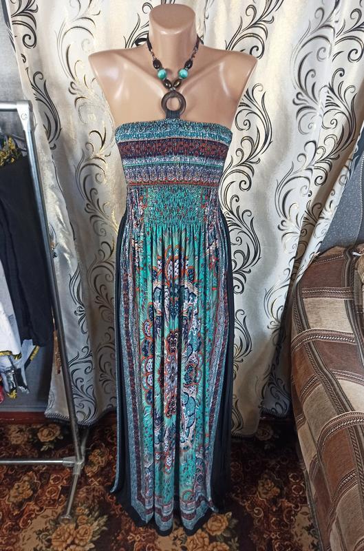 Красивий літній сарафан до підлоги cameo rose Розмір - M Заміри: - напівобхват грудей 29-52 см, - напівобхват талії 32-52 см, - напівобхват стегон 75 см, - довжина без урахування бретелей 135 см. Склад: 100% поліестер Верх на нитці-резинці. В ідеальному стані