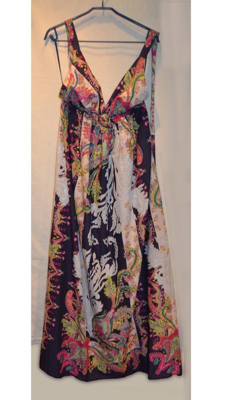Великолепный отрезной под грудью сарафан макси с открытой спинкой. Размер 14/48-50: длина без бретелей 133 см; длина от лифа до низа изделия 117 см; высота/глубина чашек лифа соответственно 26/26 см; полуокружность под грудью 38-51++ см (спереди под грудью и сзади мягкая, широкая резинка)