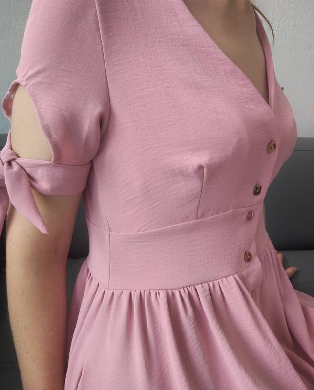 Повседневное платье миди, выполненное из легкой ткани пудрового оттенка. Имеет v - образный вырез, застежка на пуговицы по всей длине изделия. В боковых швах прорезные карманы, короткий рукав на манжетах которые завязываются.