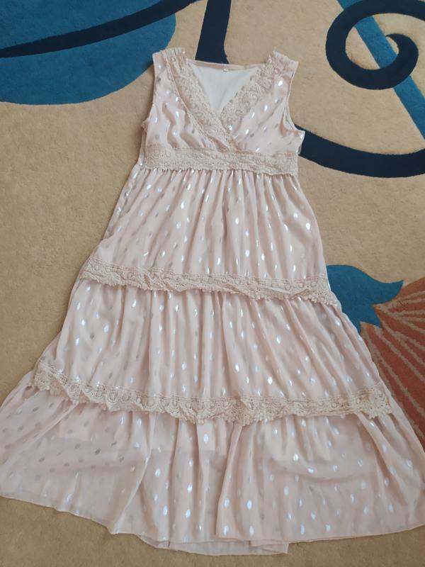 платье бежевого цвета, из шифона в горох на подкладке, сбоку молни, отделка прошвой. Плечи 36 см, ПО под руками по спине 45 см, ПО под грудью 42 см, длина 116 см.