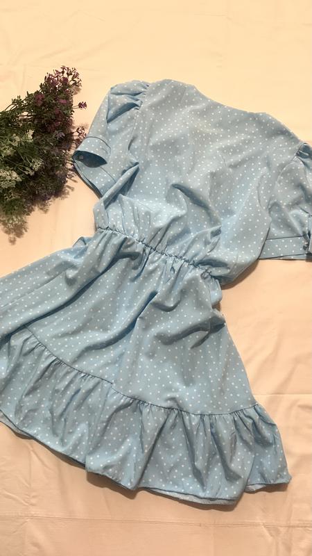 Легка літня сукня у горошок + бант на голову Матеріал - королівський софт. Колір - блакитний.