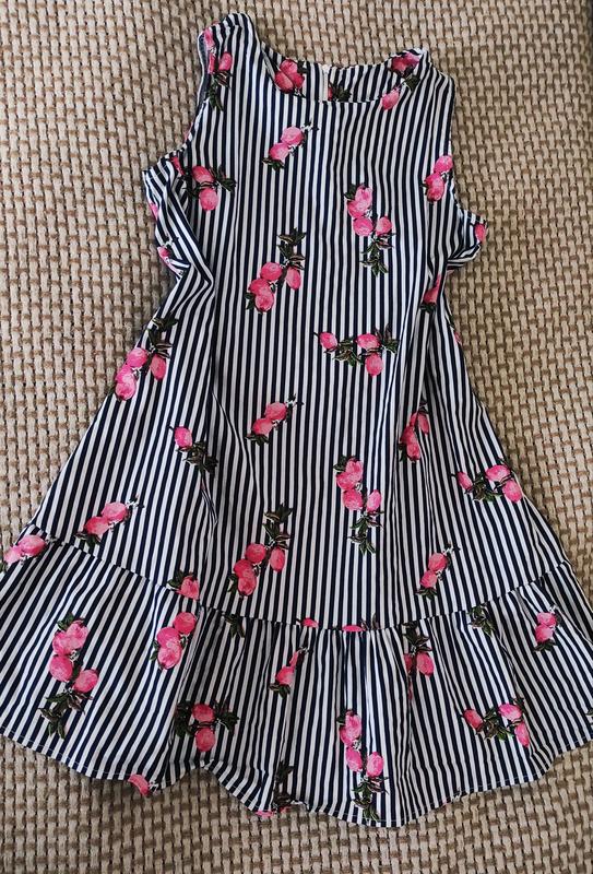 Сарафан свободного кроя, со скрытым замочком на спине. Приятного цветового решения, темно-синие и белые полоски + розовый фруктовый принт 😍 В идеальном состоянии, сарафан при плотной ткани, поэтому не просвечивается 🔥