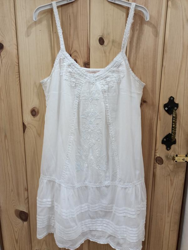 летний сарафан из нежного, легкого хлопка.меет подкладку тоже из хлопка.есть вышивка белыми и голубыми нитями.брители регулируются.