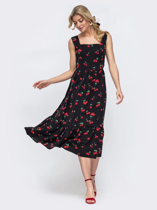 Черное платье с принтом вишенки сарафан миди ниже колен длинный на резинке с квадратным го...