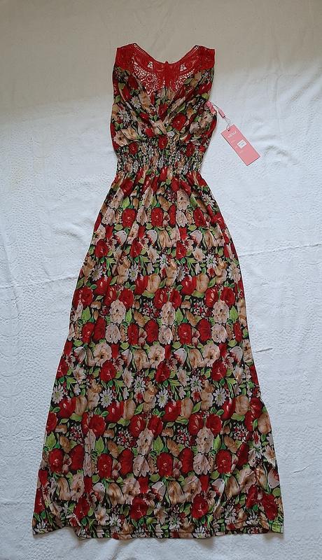 Яскрава довга сукня-сарафан, приемна легка тканина, прикрашена мереживом, нова, довжина 134 см, розмiр s-m.