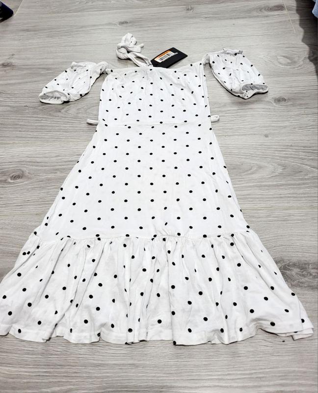 Продам новый сарафан в горошек, с биркой. Размер указанный xs (6). Замеры: Объем груди - 34 см Объем талии-32 см Бедра свободные. Рукава можно носить в двух вариантах (на плечах и успустить) Длина по спинке – 67 см Тканина тягнеться.