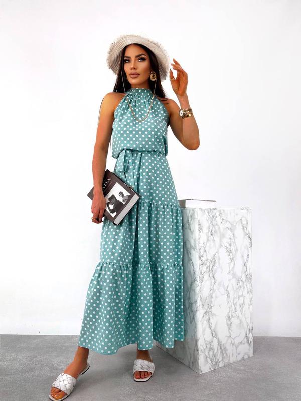 Сарафан арт. pani. 406 Стильний сарафан максі довжини. Модель з гумкою на талії і довгою розкльошеною спідницею з воланами, пояс в комплекті. Тканина: євро софт Колір: м'ята Розміри: S, M, L, XL