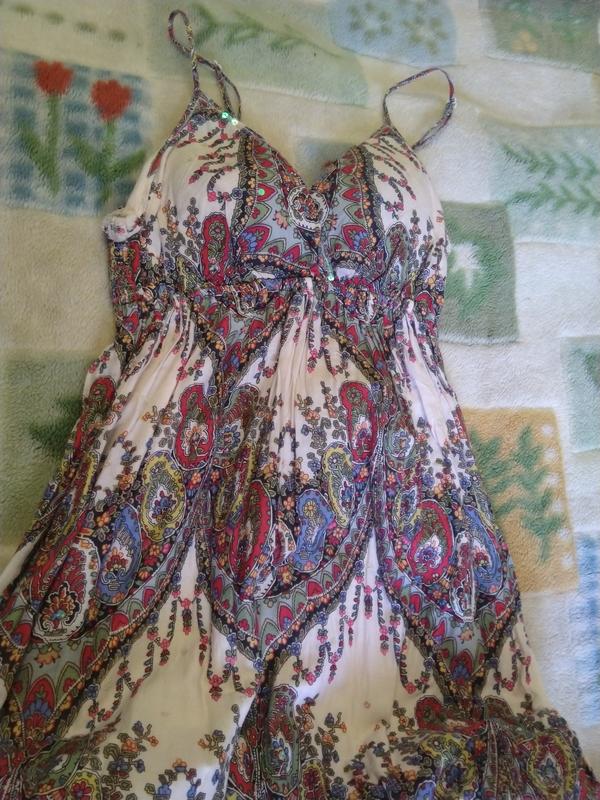 Очень красивое фирменное орегинальное платье, легкое приемное на ощупь, тоненькое,е подкладку, ткань х/б, хорошо ложится по телу, длина -150см, полу обхват груди -42см, под грудью резинка, очень красиво смотрится.