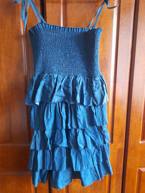 Сарафан джинсовый, ярусный, тонкий коттон. Грудь резинккой. В идеальном состоянии. На завязках. Между ярусами натуральная эластичная подкладка. Длина 68 см + завязки ПО грудь 32 см-48 см