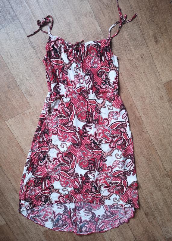 Яскоавий, вiскозний сарафан на брителях,, на зав'язках, регулюються, спереду короткий, ззаду довший. Лёгкий, приэмний до тiла