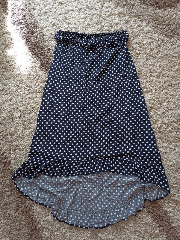 сарафан без бретелек. держится резиночкой. Очень легкий. Длина спереди 71 см. Лягает свободно. В мелкий горох.