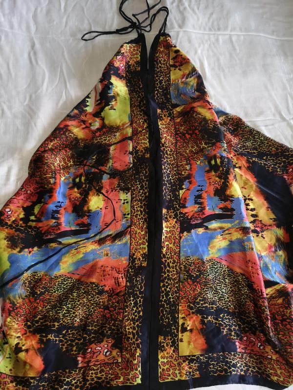 Дл. - 110/117боки. Перед-коротший, спинка голая на шнурке, на шее тоже подгон завязкой. Размер универс., раз одевался, шов внутр. на спине подшит вручную, распыленный. Полиэстер, под атлас, складками книзу, бока длиннее. Хорошо на м/l, рост до165 почти в пол, грудь любима.
