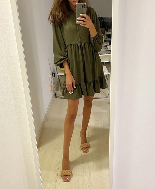 Платье Mango цвета хаки. Стан идеален, одевала один раз. Мой рост 175 см, длина платья 80 см, рукав укороченный, на резинке снизу, 55 см