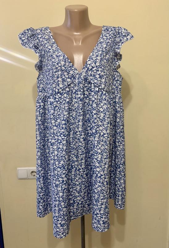 Летний пляжный сарафан парашют shein с цветочным бело-голубым принтом размер l
