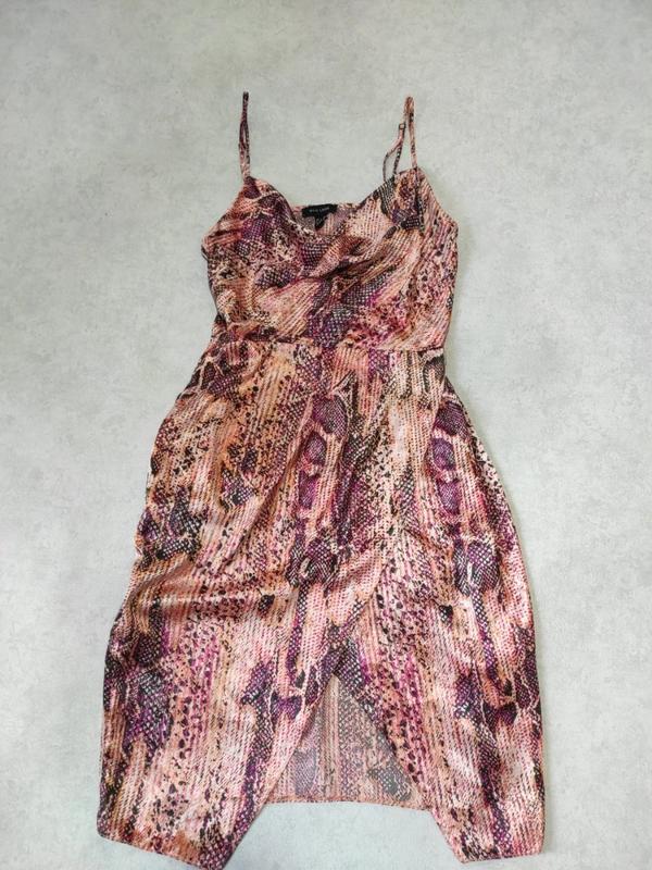 плаття в білизняному стилі, з бретельками (регульовані), горловина-хомут, спідниця на запах стан дуже гарний секонд укпзанений розмір12, тканина практично не тягнеться, орієнтуйтеся на заміри на фото тканина під атлас шовк (поліестер — еластан) з принтом пітон змія ззаду на талії гумка відтінок може відрізнятися від фото фото на тілі немає обміну та повернення немає