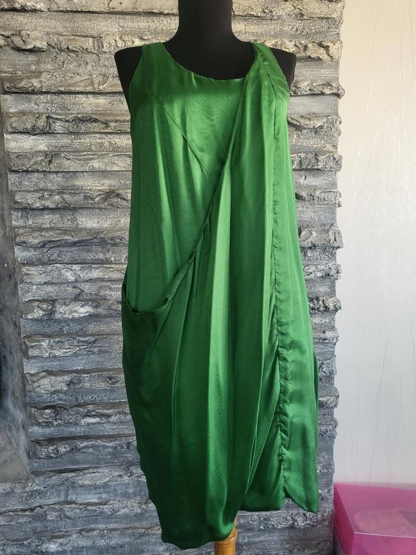 Неповторимый оттенок зеленого. Злегка хитромудрий фасон. Наличие кармана. Заявленный М. Подойдет на S, небольшой М. Полуобхват груди 43 Полуобхват бедер 46 Длина 86-98 Не тянется.