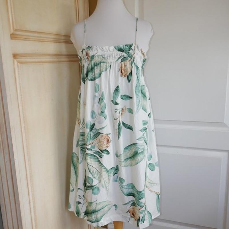Платье оформлено цветочным принтом с рисунками растений и цветов оттенков зеленого и бежевого на светлом фоне. Верхняя часть платья имеет декоративные элементы, напоминающие цветы, придающие романтичность образу. Благодаря юбке свободного кроя, платье выглядит легко и воздушно, что делает его подходящим для теплой погоды или для летних мероприятий.