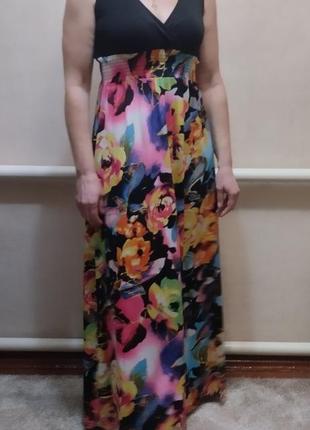 Продам літній довгий сарафан. Розмір 46-48. Заміри: Ог-84 см, тягнеться до 100 см, От: на резинці- 62 см, тягнеться до 100 см, бедра вільні від 140 см, тягнеться до 160 см, довжина - 147 см. На фото розмір М/46, зріст 173 см.