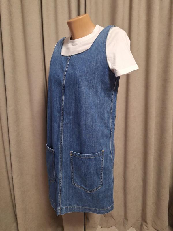 Джинсовый сарафан.Можно носить с футболкой,водолазкой.И самостоятельно.Красивый вырез на спинке,красиво смотрится на голое тело.Катон плотный,хорошо держит форму.Красивая джинса.Хорошо сядет на S M.Замеры на фото.