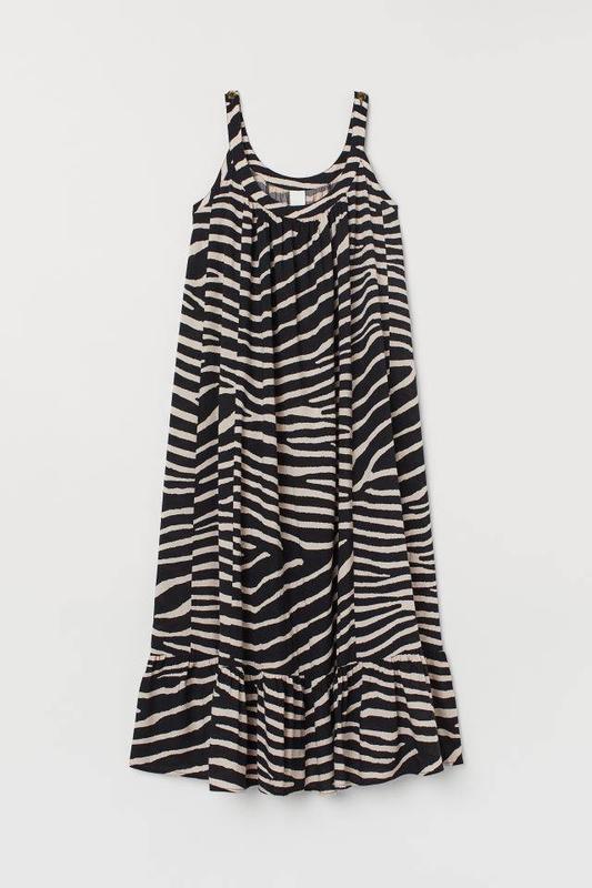 Большой размер! Довга широка сукня-сарафан. Бретели с пуговицей сверху, широкая оборка по низу, без подкладки, не светится. Ткань 100% вискоза, черный/светло-бежевый зебра принт. Размер us18/eur50, замеры: ПОГ 70 см, длина 135 см