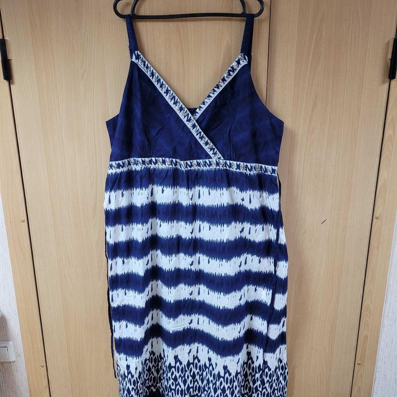 Длинный сарафан очень большого размера.Лямки регулируются, талия завышенная с завязками, спинка прострочены мелкими резинками, декор серебряные пайетки. Новый, без бумажной этикетки. Люкс сток.Цвета тёмно-синий, молочный. Ог 130+, талия 120-, Об 154, длина 129+-.