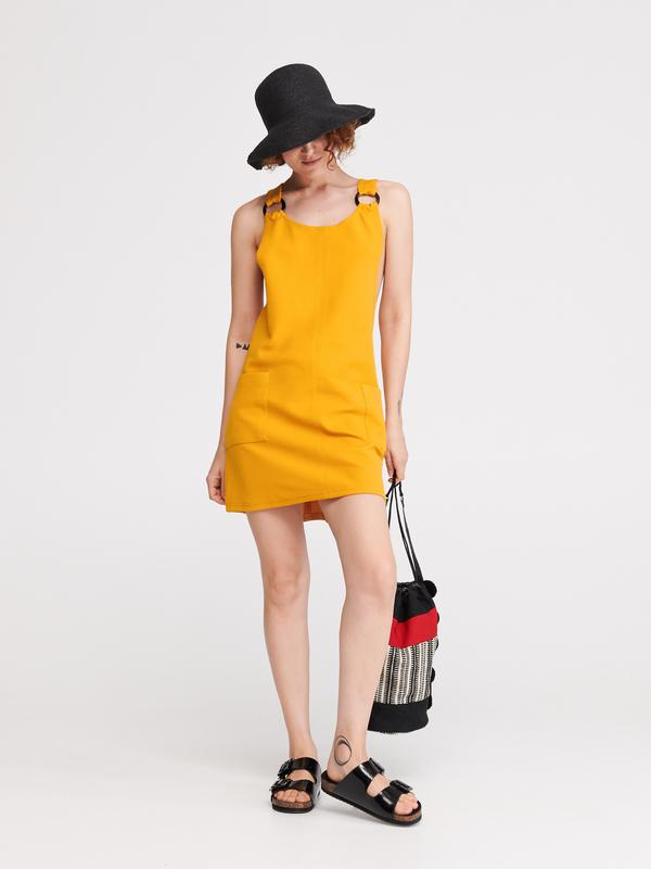 летний трикотажный сарафан горчичного цвета. К низу свободнее, по бирке Л, можно Л-ХЛ. Открытка вкрпоштой и новой почтой