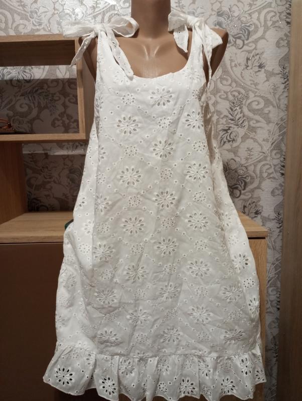 Літній, новий сарафан прошва. Колір білий. Тканина відмінної якості, схожа на якісну бавовну ( хоча полестр), є підкладка. Тканина легенька, дихаюча, не тягнеться. Крій трапецевидний. Зав'язується на плечах. Довжина 91 см, пог 54 см, пот 55 см, поб 59 см.