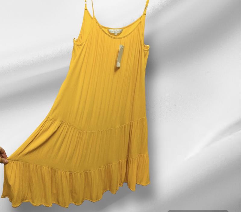 Платье сарафан на брителях от бренда F&F желтого цвета. Цвет: желтый Тканевая : вискоза Размер : XL Замеры: ОТ 114 см ОГ 114 см Длина по спинке 78 см Цена : 559 грн. Обратите внимание, что цвет платья на фото может отличаться!!! Давайте будем благодарны за подписку на наш магазин! С нетерпением ожидаем Ваших заказов!!!