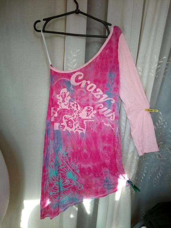 Интересное летнее платье на одно плечо с одним рукавом. Низ тоже асимметричен. Красивая ткань, стрейч трикотаж. размер Л, тянется. Оригинальный пляжный вариант. сзади такаж сама ткань, только без надписи. цена указана с учетом курса сайта 14, 4%