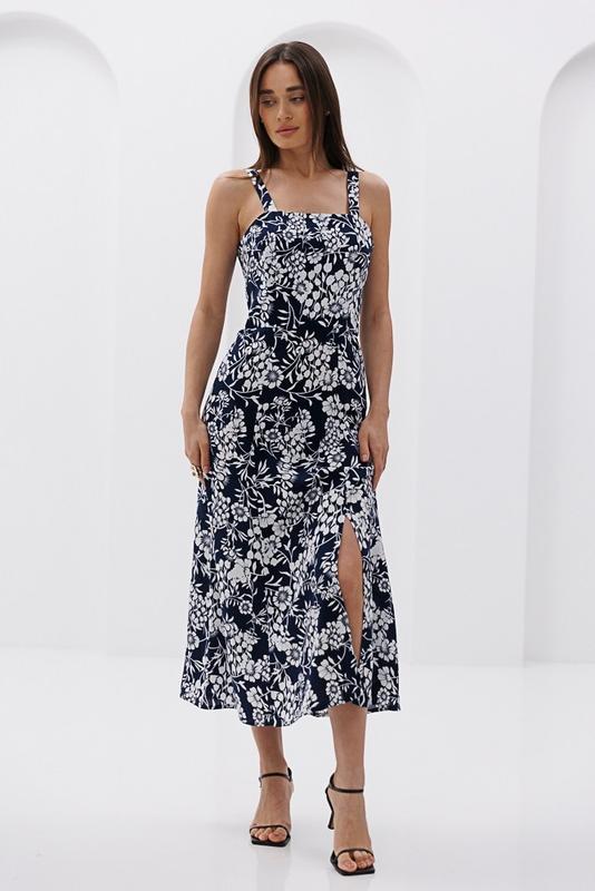 Женское летнее платье миди темно-синее с цветочными узорами и разрезом
