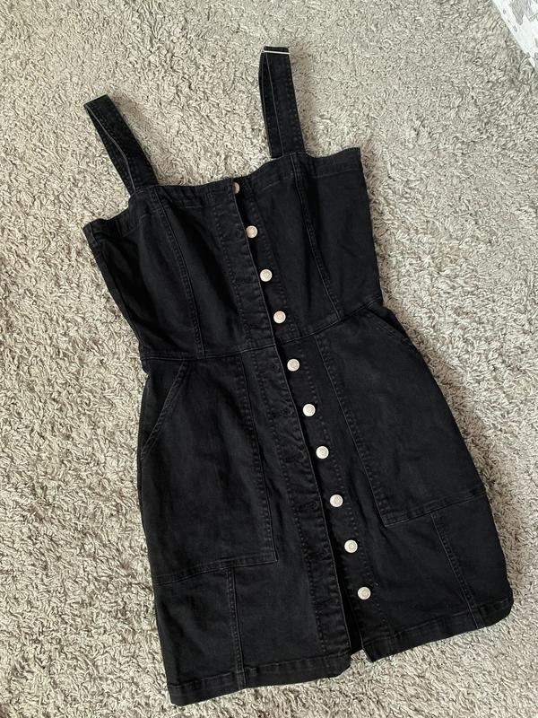 Черный сарафан в идеальном состоянии, цвет не выгорает, ткань тянется, стрейчевая. На пуговицах, лямки регулируются, большие кармашки.