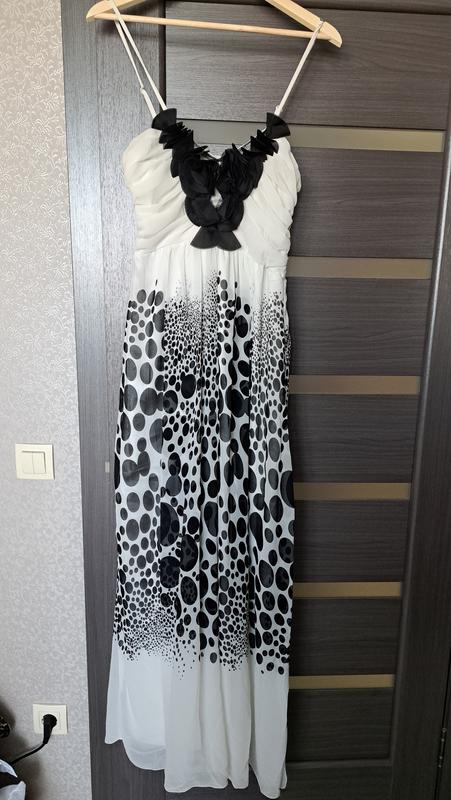 Сарафан Макси шифоновый на бретелях белый в принт горохи, отделанный 3D аппликацией в области груди, имеет атласный белый подклад. Размер ориентовочно M-L (Берки срезанные). Состояние очень хорошее (без дефектов, в носке несколько раз). Замеры: ПОГ 45-50см. Линия под грудью отрезная ПО 45-48 см. Талия и бедра свободно – до 62-63см. Длина сарафана без бретелей - 130см, с бретелями - 145см. (бретели можно отрегулировать). Состав: верхняя ткань шифон, нижняя ткань атлас.