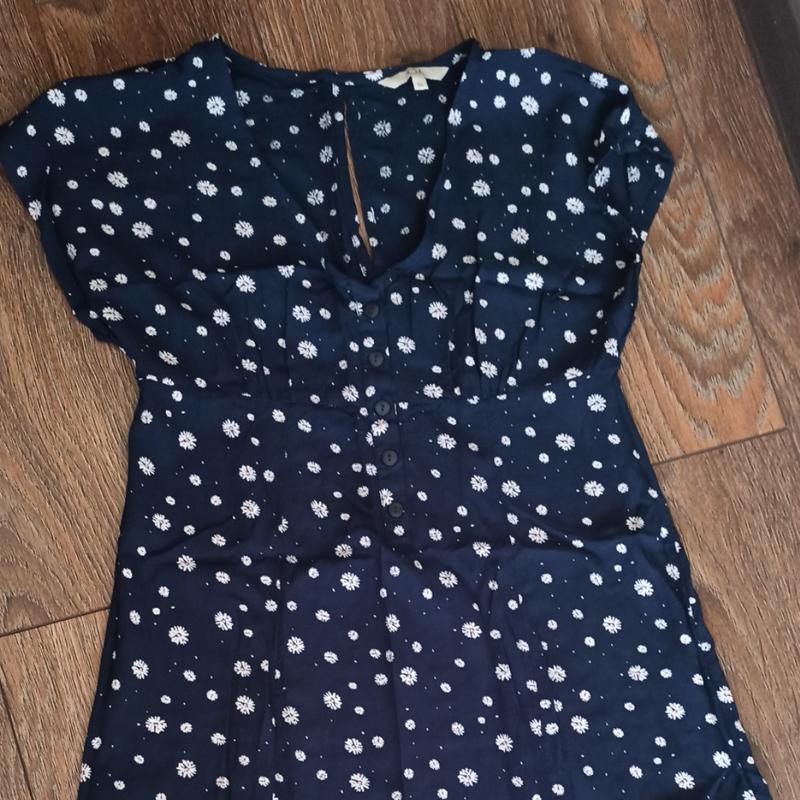 Платье на лето, свободного кроя. Размер S, от фирмы С&А, 100% вискоза, принт ромашки. Легкое, цвет темно-синий. Замеры: - длина 80см - ПО плечей 36см - ПО груди 38см - распорки внизу по 13см - вырез 17см. Гудзики расщипываются, есть вырез небольшой на спинке. Одито на рост 157см, размер XS. Отпрашиваю Укр или Новой по почте по предоплате на карточку.