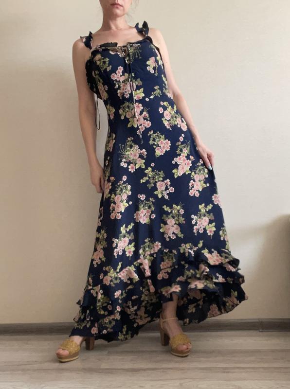 Сарафан в цветочный принт из 100% вискозы, сзади идет резинка, через легки ненавязчивые влаги, по низу идет три уровня воланов, рассчитан на высокий щёрт( на фото 165+ каблука 10 см), слева сбоку молния, перед чуть выше задней части, верх идет на подкладке, размер указан 52, немного маломерит на 50 НОГ-50+виточки НОТ-46 НОС-58