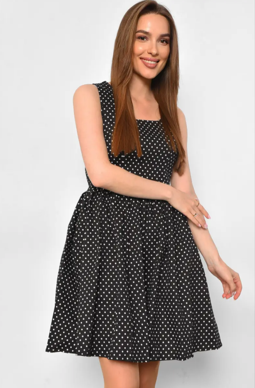 Цей чорний сарафан з білим горохом – чудовий вибір для спекотного літнього дня. Він виготовлений з м'якої, еластичної тканини, яка забезпечить комфорт протягом дня. Сарафан має приталений силует, який підкреслює талію, і кльошну спідницю до коліна, яка вільно спадає. Принт у горох робить образ жіночним і романтичним. Розмір - М Ширина під руками/талія - 40 см Довжина спідниці - 50 см Матеріал - котон