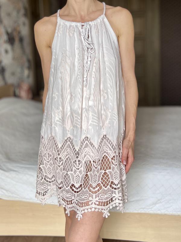 Очень нежное платье в туловичном стиле. Сделана в Италии. Легкая, удобная, красивая с вышивкой и кружевом. На подкладке с валаном из батиста и шелка. На первом фото валан подобранная, просто показала как вариант. По горловине на мягком канате. Горловину по канату возможно сделать или тоньше или шире. Красиво подойдет как по городу в жаркую погоду, так и на отдых, очень нежно и элегантно смотрится с каблуками.
