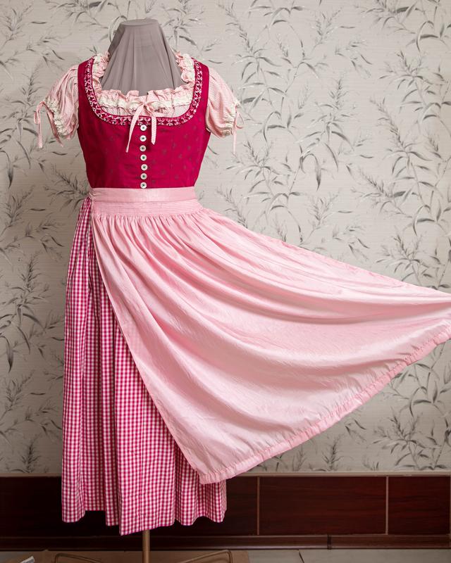 Довгий рожевий дірндль у клітинку (сукня, передник, сорочка) Hammerschmid, Stockerpoint (Австрія) Розмір D/NL 38 (S) МАТЕРІАЛ (точний опис матеріалів на фото) Сукня: 100% Cotton Корсетна частина зі щільного полотна, прикрашена дрібним флористичним принтом. Бавовняна підкладка під корсетною частиною. Спідниця у клітинку, без підкладки. Є кишеня справа. Передник: 60% Polyester (шарудить під час руху) 40% Polyamid Сорочка: 55% Polyester 45% Cotton МІРКИ Сукня: Півобхват грудей - 48 см Півобхват талії - 40 см Висота корсету - 38 см (від плечового шва до шва по талії) Довжина спідниці - 83 см (від шва по талії), +8 см можна відпустити. Сорочка: Півобхват талії - 42 см по корсетику Шов під грудьми - 38 см Підобхват грудей - 47 см (тягнеться) Висота від плеча до низу - 53 см Плечі й рукавчата на гумках, тому підійдуть. Передник: Довжина - 81 см Ширина - 81 см по низу, 33 см в поясі Загальна довжина поясу - 297 см (по 132 см зав'язки з кожного боку) Сорочка з прошвою до дірндля (Serbia) Розмір 38 Матеріал: 65% бавовна 35% поліестер Гумка на рукавцях-ліхтариках та під грудьми Застібка: на ґудзиках спереді і сукня, і сорочка. Є по запасному. На сукні ще дві кнопки по сорочці. На сорочці гачок та зав'язка. Стан - відмінний, мереживо на сорочці має жовтуватий відтінок Art. FVD-003-38 Відправка "Нова пошта" або "Укрпошта" за рахунок отримувача. Передплата 100%. Ціна 600 за весь комплект (сукня, сорочка, передник)