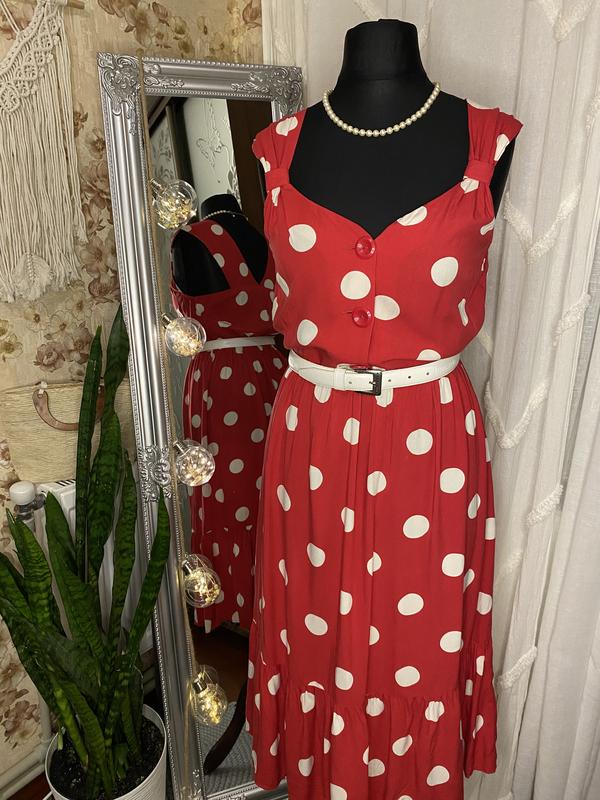 Платье длины миди в горошек, имеет широкие бретельки, на талии резинка, закрывается на пуговицы спереди (продается без пояса) Состояние - идеальный Размер - S/М Полуобхват груди - 44 см. Полуобхват талии - 37 см. Длина - 118 см.