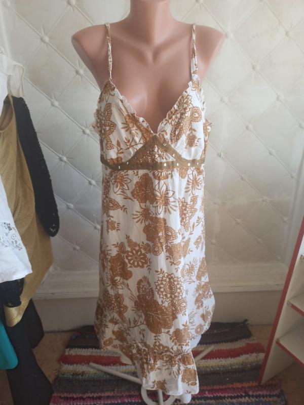 Легкий сарафан, натуральная ткань, чуточку разошелся шов круг замочка, а так состояние шикарный, пог 51 см., пот 48 см., поб 62 см., длина с брительницами 106,