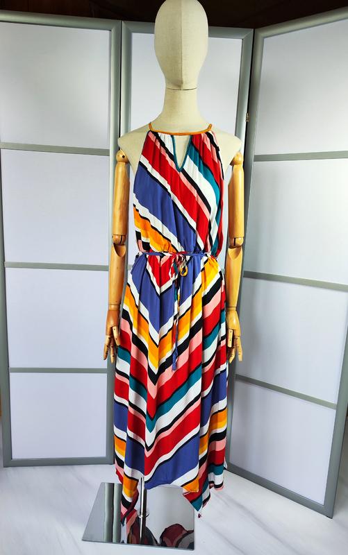 PAPAYA 🍓великолепный яркий сарафан из 100% вискозы, прекрасно драпируется, не просвечивает Асимметричный низ, по талии резинка Идеальное состояние Размер UK 20 длина от плеча -118/135 от плеча до талии -45 полу охват в груди -бл.56 в талии- 45-55 в бедрах- 72 Возвращение не предусмотрено