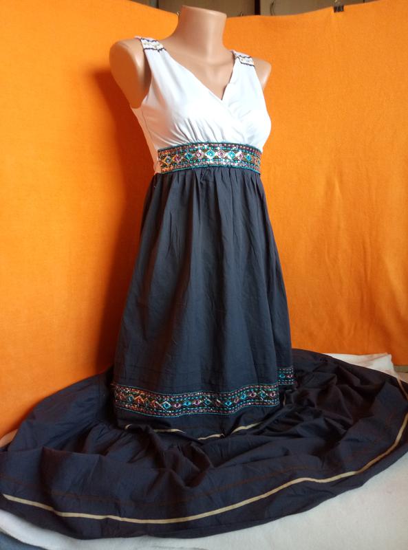 --Сарафан макси бренда One She. Новое, с биркой. --Цол верха-белый, низ-насыщенный серый с нашитыми элементами в пайетку. --Лиф по фигуре, на запах. Из двойной ткани. Низ пышный, с воланом по низу. Потайная молния в левом шве. --Ткань лифу-нежный на ощупь, трикотаж. Низ-тонкая, но удерживающая форму, натуральная. Немного просвечивает. Склад: 100 % котон. --Размер указан L, но маломерит до 44-46-го. --Вымеры: полуобъем груди-43, тянется до 48, полуобъем талии-34, тянется до 39, полуобъем бедер-65, длина от плеча до низа-138 см. На рост 164 на 1 см от пола. Перешлю Укр и Новой по почте.