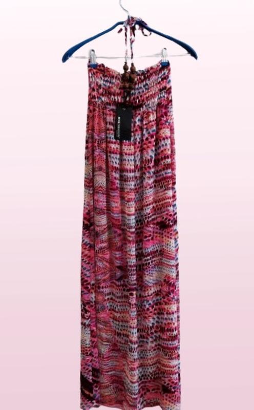 Сарафан бандо от итальянского бренда Pink Shadow. На топе резиночки. Верх: плотный шифон. Есть тонкая подкладка.. Ткань мягкая, легкая, не тянется. (6104) Размер: М Полуобхват груди: 29 см, тянется до 52 см Полуобхват бедер: 53 см Высота резинок на топе: 12,5 см Длина изделия: 123 см Состав: 100% полиэстер