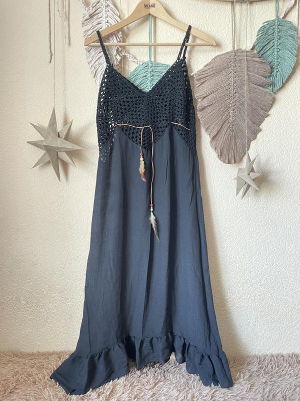 дуже стильний сарафан, купувала собі на острові Маврикій, надягала 1-2 рази стан ідеальний, без дефектів силует просвічує, тому підійде на море розмір комфортно підійде на С-М довжина 112см пог 41-46см пот 44-47см пос до 52см фото на тілі надішлю у повідомлення)