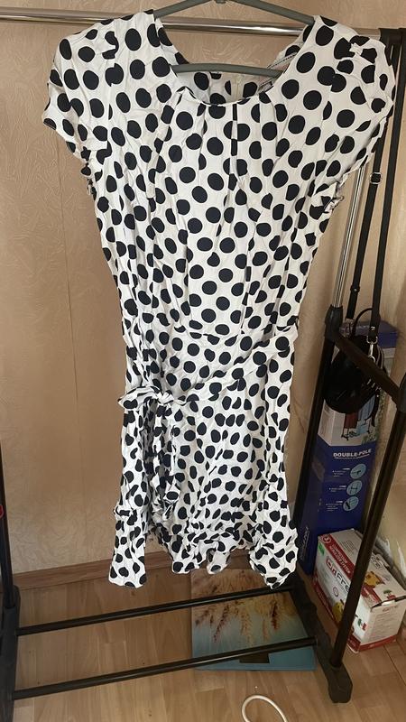 Платье в горох приталено по молнии с пояском Длина 87 Ног 38 Рукав 15 Нос 40 Ширина низ 83