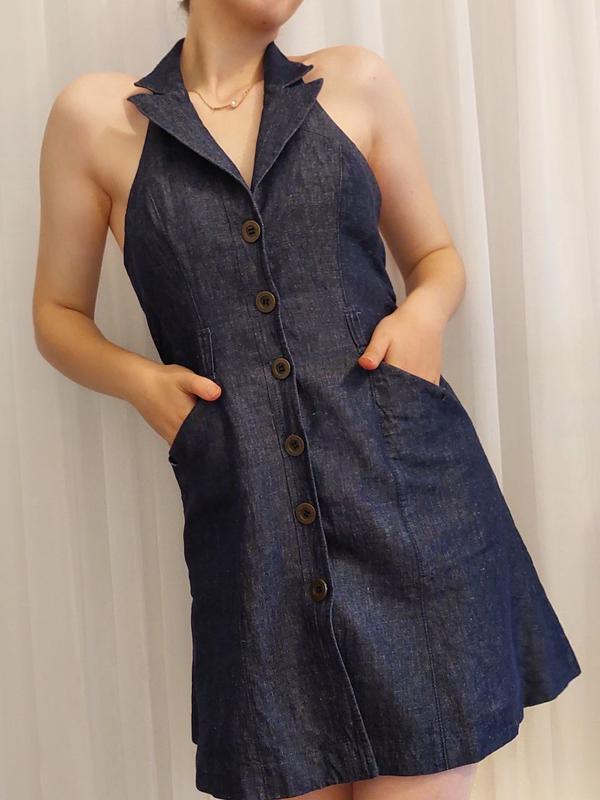 Женский сарафан из тонкого темно-синего джинса, летний фасон. Размер: EUR 40 Талия: максимальный 80 см (есть вшитые петли для пояса) Застегивается на пуговицы и карманы тоже на пуговицы. Длина от проймы до низа – 64 см, от воротничка до низа – 93 см.