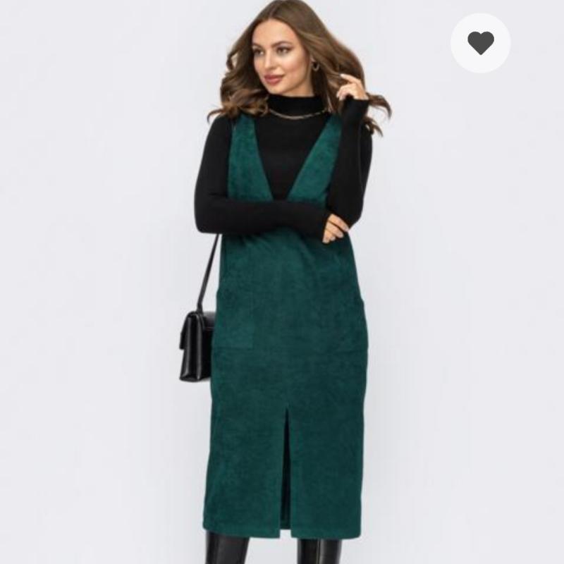 Сарафан із вельвету, не сильно щільний, з глибоким V-подібним вирізом, темно-зеленого кольору, на пілочці сарафана — накладні кишені, без рукавів, довжина міді, силует прямий, без візерунка, на спідниці високий зручний розріз.Заміри сарафана: довжина виробу — 112 см, ПОГ-50+, ПОТ-53 см, НОС-54 см, розліт плечовий-45+.Сарафан новий, р/р 50/52, найвідомішої марки DRESSA. Перш ніж зробити замовлення — уточнюйте наявність товару.