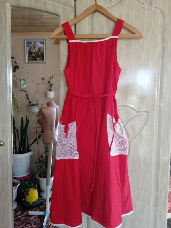 Состояние очень хорошее. Цвет насыщено красный с белыми сеточками кармашками.д 94, плечи 26,. пог50, пот36 50- тянется резинка, низ 128.