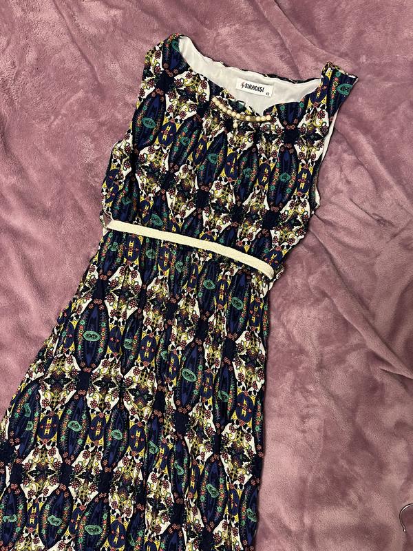Летний женский сарафан. Длинное, состояние хорошее, качество приятное к телу. Размер М-Л. Есть маленький нюанс (на аксессуаре нет 2 жемчужинки).