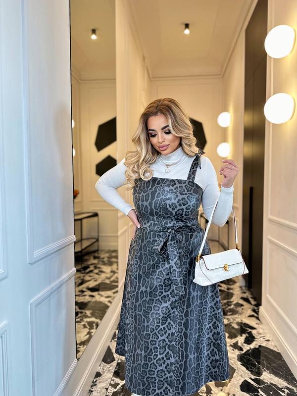 9.10.б Ткань: кожа Размер :48-50,52-54,56-58,60-62 Цвет:кор лео,черный лео,бежевый,черный (фото позже) Длина от спинки 100/102/104/106 см Невероятно стильный и комфортный сарафан из кожи – идеальный выбор для современной модницы. Этот сарафан станет изысканной изюминкой вашего гардероба, сочетая в себе смелость и элегантность. • Дизайн: Удобный фасон с регулируемыми бретелями позволяет легко адаптировать сарафан к любой фигуре. Благодаря поясу на талии, вы сможете подчеркнуть свои женственные линии. • Универсальность: отлично подходит как для повседневных образов с гольфом или футболкой, так и для праздничных выходов. • Стиль: Животный принт добавляет нотку смелости и эксклюзивности, гарантируя, что вы будете выглядеть на все 100%. • Размеры: В наличии большие размеры – созданы с учетом особенностей фигуры, чтобы вы чувствовали себя максимально комфортно Замеры: 48-50 ОГ от 103 52-54 ОГ от 113 56-58 ОГ от 123 60-62 ОГ от 133