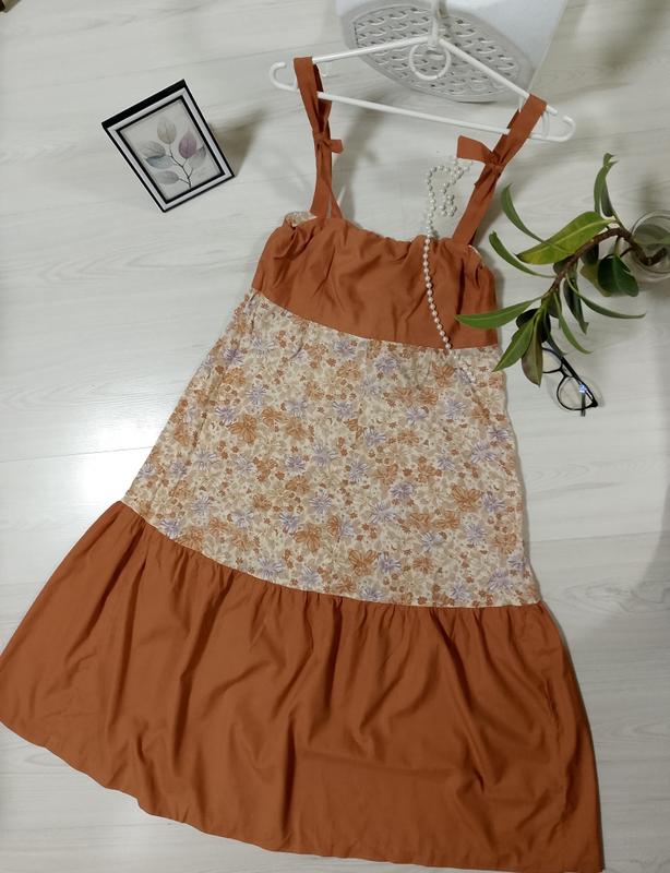 Сарафан с рюшами/ цветами. Цвет оранжевый (кирпич), бежевый, фиолетовый. Размер не указан. Може бути xs/s. Линия груди 42, тянется до 46 см, зверза на резинке. Линия под грудью 40 см. Длина без бретелей 97 см. Длина с бретельками 115см, регулируется. Сзади на скрытой молнии 33 см.+ резинка.